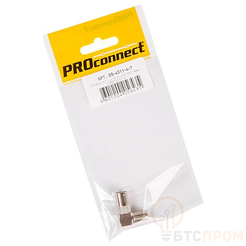 Антенный переходник гнездо F - штекер TV PROconnect используется для подключения эфирного, спутникового и кабельного телевидения с помощью радиочастотного кабеля. Устройство обеспечивает качественную передачу видео и аудиосигнала с минимальным уровнем потерь. Угловая форма переходника позволяет подсоединять провода в ограниченном пространстве, исключая сильные перегибы. В процессе установки сторона с гнездом F накручивается на кабель, оконцованный F-разъемом, а сторона со штекер TV стыкуется с оборудованием. Монтаж не требует пайки контактов и использования специальных инструментов: может производиться в удаленных местах, таких как крыши домов или комплексов. Изготовлен из никелированного цинка. Подходит для кабелей RG-6, SAT-50, SAT-703, DG-113, имеющих наружный диаметр около 6,8 мм. В комплекте поставляется 1 переходник.