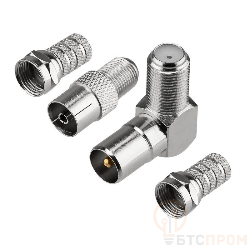 Набор антенных разъемов №2 предназначен для оконцевания кабелей. В наборе угловой переходник (гнездо F – гнездо TV), угловой переходник (гнездо F – штекер TV) и 2 F-разъема RG-6. Разъемы обеспечивают высокую стойкость соединения. Изготовлены из никелированного сплава меди (биметалл). Переходники выполнены в угловой форме, что позволяет соединять провода и подключать кабель к оборудованию в ограниченном пространстве под прямым углом 90°, исключая сильные перегибы. Материал изготовления переходников – никелированный сплав первичной меди, что обеспечивает долговечность соединения и минимальный уровень потери качества сигнала.