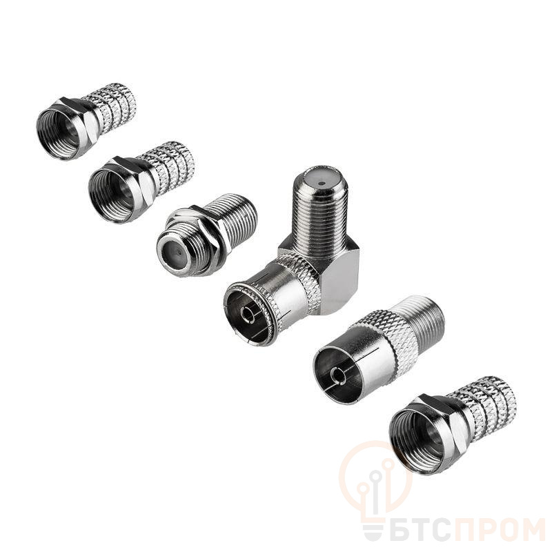 Набор антенных разъемов №9 предназначен для оконцевания кабелей. В наборе 1 угловой переходник (гнездо F – гнездо TV), 1 переходник (гнездо F – гнездо TV), 1 переходник (гнездо F – гнездо F, бочка с кольцом) и 4 F-разъема RG-6. Разъемы обеспечивают высокую стойкость соединения. Изготовлены из никелированного сплава меди (биметалл). Угловой переходник также изготовлен из никелированного сплава первичной меди, что обеспечивает долговечность и минимальный уровень потери качества сигнала. Угловая форма переходника позволяет соединять провода и подключать кабель к оборудованию в ограниченном пространстве под прямым углом 90°, исключая сильные перегибы. Переходник гнездо F – гнездо TV выполнен из никелированного сплава первичной меди. Позволяет соединить два кабеля, которые имеют на концах разные типы ТВ-разъемов. Переходник гнездо F – гнездо F относится к типу бочка, поставляется с кольцом. Материал изготовления – никелированный цинк, обеспечивающий надежность и возможность использования в условиях климатических перепадов.