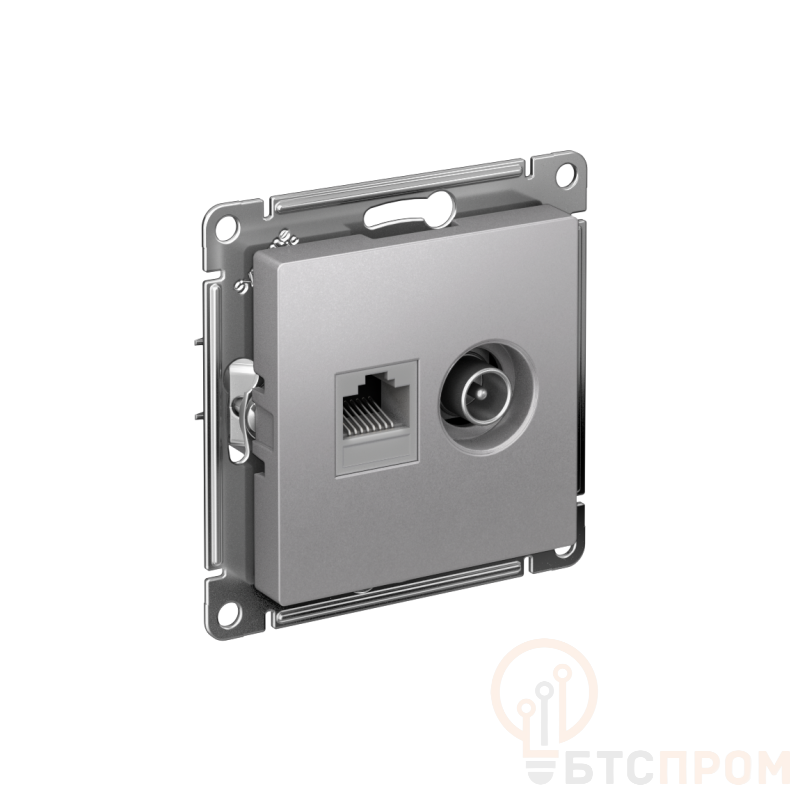 Механизм Systeme Electric (ранее Schneider Electric) серии AtlasDesign в цвете алюминий двойной розетки разъёмами RJ45 категория 5е и TV предназначен для удобного и быстрого подключения вашего компьютера и телевизора к соответствующим сетям. - Лицевые детали из качественного ABS-пластика, устойчивого к царапинам и УФ-излучению. - Усиленные прямые монтажные лапки для лучшей фиксации механизма в монтажной коробке.