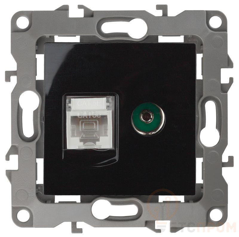 Розетка телевизионная + интернет серии Эра 12 скрытой установки механизм цвет чёрный 12-3110-06. Сделана из поликарбоната. Монтаж в подрозетник производится и на лапки, и на винты. Рамки приобретаются отдельно.