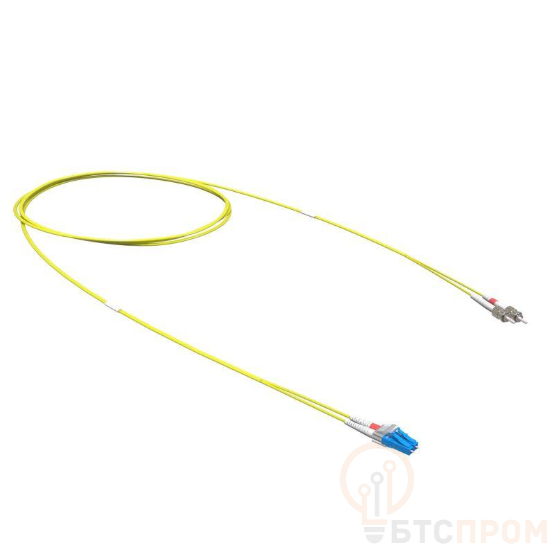 Оптический коммутационный дуплексный одномодовый переходной шнур. Оболочки коммутационных шнуров изготовлены из малодымного безгалогенного компаунда. Характеристики одномодового оптического волокна соответствуют рекомендациям ITU-T G.652.D. Тип коннекторов - ST-LC. Тип полировки - UPC. Длина - 1 м. Цвет оболочки кабеля - жёлтый