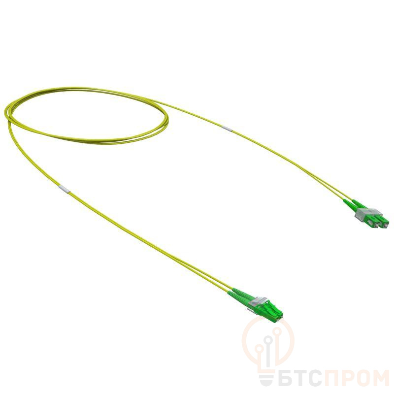 Оптический коммутационный дуплексный одномодовый переходной шнур. Оболочки коммутационных шнуров изготовлены из малодымного безгалогенного компаунда. Характеристики одномодового оптического волокна соответствуют рекомендациям ITU-T G.652.D. Тип коннекторов - SC-LC. Тип полировки - SC APC, LC UPC. Длина - 2 м. Цвет оболочки кабеля - жёлтый