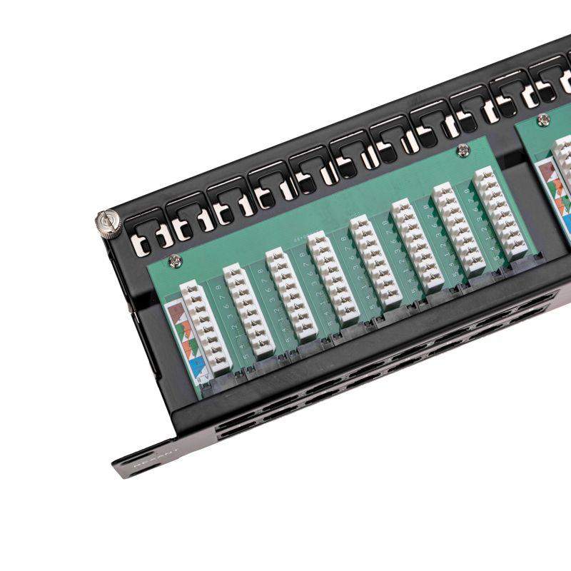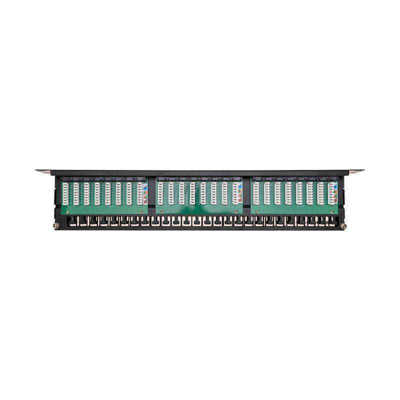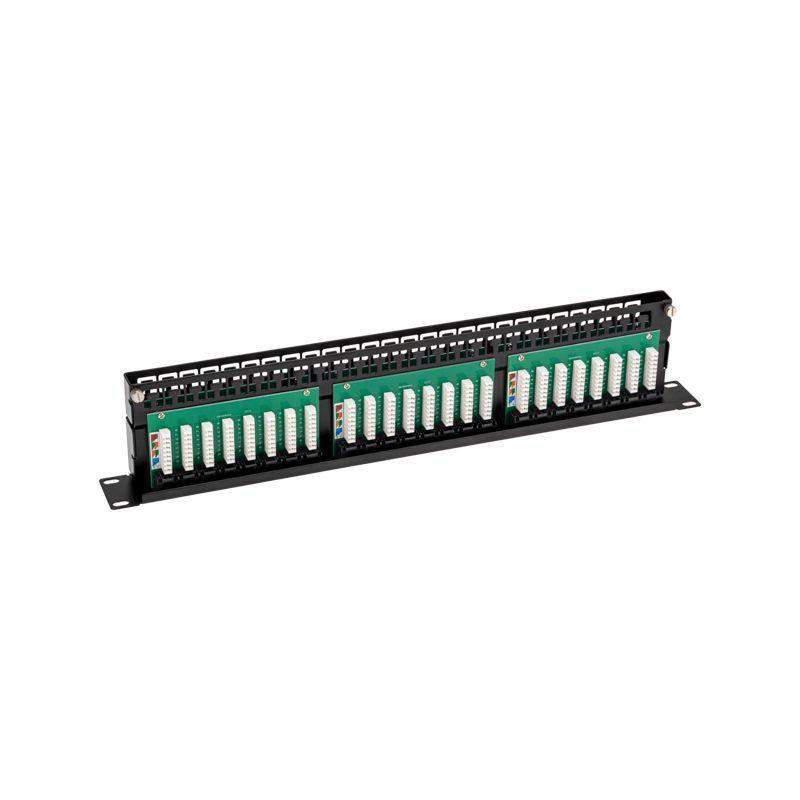Патч-панель (коммутационная панель) UTP категории 5e используется при построении структурированных кабельных сетей. Относится к пассивному сетевому оборудованию. Служит для быстрой и удобной коммутации кабелей между активным сетевым оборудованием и рабочими местами (станционной и абонентской частями). Позволяет организовать пространство внутри информационных шкафов и упорядочить кабельную разводку. На передней стороне расположены 48 портов RJ-45. От каждого порта выводится контакт на обратную сторону панели, на которой находятся IDC-коннекторы, посредством которых осуществляется фиксированное соединение с кабелями. Все разъемы пронумерованы, предусмотрена цветовая и цифровая индикация. Патч-панель монтируется в стойку 19''. Выполнена из высококачественных прочных материалов. В комплекте поставляются органайзеры, которые облегчают монтаж кабелей и их распределение. Технические характеристики: Подключаемые проводники: одножильные 22-26 AWG Количество подключений: не менее 750 циклов Усилие удержания разъема: 50Н/1 мин Корпус: сталь 1.6 мм Печатная плата (РСВ): двухслойный стеклотекстолит (FR-4) 1.6 мм Корпус: ударопрочный ABS-пластик, UL-94V-0 Корпус IDC-модуля: поликарбонат (РС), UL-94V-0 Разъемы: ABS-пластик, UL-94V-0, контакты – фосфористая бронза с напылением золотом 1.27 мкм поверх 2.54 мкм никеля IDC-контакты: фосфористая бронза с покрытием 2.54 мкм сплавом олова