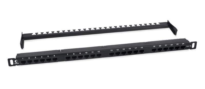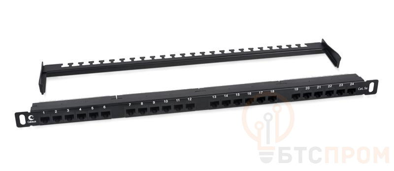Конструкция патч-панели включает в себя задний кабельный организатор, который упорядочивает силовые и коммутационные шнуры, поддерживая порядок в телекоммуникационной стойке и способствуя эффективному охлаждению оборудования. Позолоченные контакты (50 микродюймов) обеспечивают стабильное и надежное соединение, соответствующее стандарту категории 5e для передачи данных на частоте до 100 МГц.