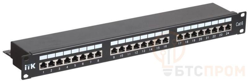 Коммутационные панели или патч-панели являются важнейшей частью любой СКС и IT-инфраструктуры здания и сооружения с большим количеством информационных розеток и терминальных портов конечных пользователей, которые необходимо коммутировать на порты активного сетевого оборудования, размещенного в серверных и распределительных узлах. В зависимости от способа крепления, масштабности кабельной системы, типа сети ITK изготавливает патч-панели для настенного монтажа или монтажа в 19-дюймовый конструктив, по количеству портов: 12-, 24-, 25-, 48-, 50-, категорий: 3 (телефонные), 5E, 6, 6A, в экранированном исполнении и без защитного экрана. Патч-панели для монтажа в 19" шкаф или стойку соответствуют стандарту 19" (482,6 мм), имеют отверстия с левой и правой стороны для крепления на профиль, производятся высотой 0,5, 1 или 2 юнита. На передней стороне все патч-панели ITK имеют специальную площадку для дополнительной маркировки и цифровую нумерацию портов, на обратной стороне модули IDC имеют цветовую и цифровую нумерацию. Также для облегчения монтажа и укладки кабелей имеются изделия с кабельным органайзером спереди или сзади. Патч-панели соответствуют международным стандартам UL 1863, ISO/IEC 11801:2002, TIA/EIA-568-B, кодировка проводников в соответствии с T568B и A. Поставляются в картонной коробке с крепежом.