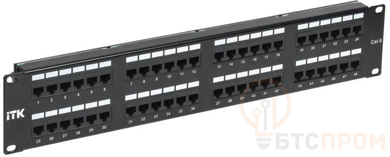 Коммутационные панели или патч-панели являются важнейшей частью любой СКС и IT-инфраструктуры здания и сооружения с большим количеством информационных розеток и терминальных портов конечных пользователей, которые необходимо коммутировать на порты активного сетевого оборудования, размещенного в серверных и распределительных узлах. В зависимости от способа крепления, масштабности кабельной системы, типа сети ITK изготавливает патч-панели для настенного монтажа или монтажа в 19-дюймовый конструктив, по количеству портов: 12-, 24-, 25-, 48-, 50-, категорий: 3 (телефонные), 5E, 6, 6A, в экранированном исполнении и без защитного экрана. Патч-панели для монтажа в 19" шкаф или стойку соответствуют стандарту 19" (482,6 мм), имеют отверстия с левой и правой стороны для крепления на профиль, производятся высотой 0,5, 1 или 2 юнита. На передней стороне все патч-панели ITK имеют специальную площадку для дополнительной маркировки и цифровую нумерацию портов, на обратной стороне модули IDC имеют цветовую и цифровую нумерацию. Также для облегчения монтажа и укладки кабелей имеются изделия с кабельным органайзером спереди или сзади. Патч-панели соответствуют международным стандартам UL 1863, ISO/IEC 11801:2002, TIA/EIA-568-B, кодировка проводников в соответствии с T568B и A. Поставляются в картонной коробке с крепежом.