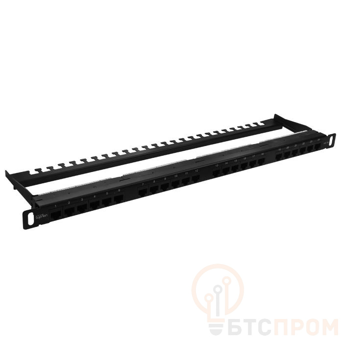 Коммутационные панели (патч-панели) предназначены для терминирования на них кабелей различных подсистем СКС и для коммутации отдельных элементов сети друг с другом при помощи коммутационных шнуров. Неэкранированная патч-панель SUPRLAN выполнена в 19” формате и предназначена для установки в телекоммуникационные шкафы и стойки. Соответствует характеристикам категории 5е. Высота 0,5U. Имеет 24 порта RJ-45. С лицевой стороны все порты пронумерованы. С тыльной стороны патч-панели размещены контакты типа Dual IDC с цветной маркировкой по двум стандартам - T568 А и B. Ножи контактов располагаются под 45°, что лучше сказывается на передаточных характеристиках разъема. Для заделки проводников подходят ножи тип 110 и Krone. Патч-панель имеет встроенные задние организаторы для фиксации кабелей.