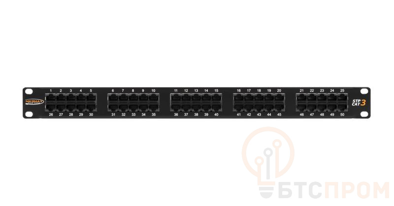 Панель коммутационная 19дюйм 1U телефон.50 портов кат.3 класс C 16МГц RJ45/8P6C110/KRONE с заземл. с органайзером черн. NIKOMAX NMC-RP50UC3-1U-BK