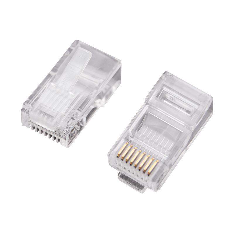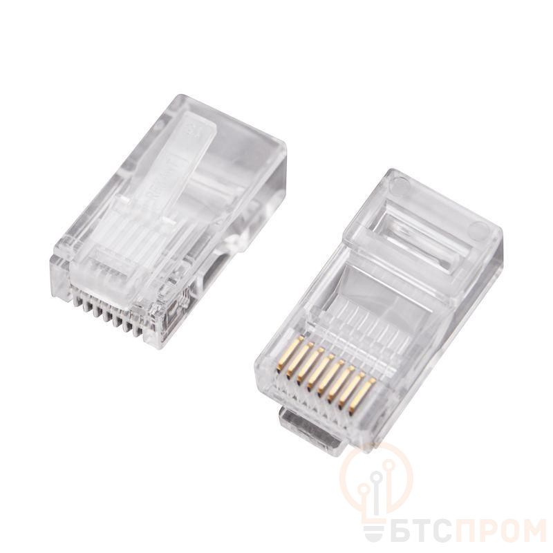 Разъем RJ-45 (8P8C) REXANT под витую пару, U/UTP, CAT 5e. Предназначен для соединения телекоммуникационного оборудования: компьютеров, офисных АТС, сетевых коммутаторов, концентраторов, коммутационных панелей, маршрутизаторов, патч-панелей, сетевых карт, а также другого оборудования, имеющего гнездо 8P8C. Штекер изготовлен из прозрачного качественного пластика, имеет 8 посадочных мест и 8 ножей-контактов, которые покрыты слоем технического золота 3 мкм для повышения пропускной способности разъема. Фиксация разъема на кабеле производится специальным обжимным инструментом. При изготовлении продукции использованы надежные материалы, обеспечивающие высокий уровень передачи данных, долгий срок службы, а также гарантию работоспособности товара. Технические характеристики: Исполнение: registered jack Тип разъема: RJ45 8(8) Категория: 5Е Способ присоединения: обжимной Подходит для многопроволочных проводников: да Экран: нет Слой технического золота: 3 мкм Количество контактов: 8