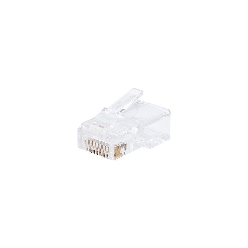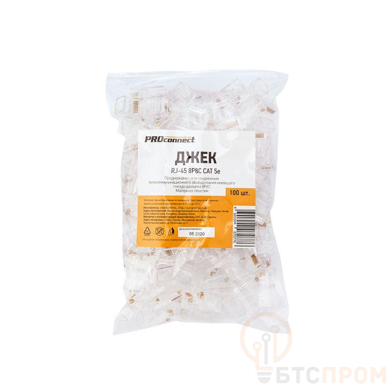 Разъем RJ-45 (8P8C) PROconnect категории 5е под витую пару предназначен для соединения телекоммуникационного оборудования (компьютеров, офисных АТС, маршрутизаторов, патч-панелей, сетевых карт) с другим оборудованием, имеющим гнездо разъема 8P8C. Размещается на конце компьютерных кабелей и соединяет их с розеткой, хабом, свитчом, сервером, роутером или другим компьютером. Изделие выполнено из прозрачного качественного пластика, имеет 8 посадочных мест и 8 ножей-контактов, которые покрыты слоем технического золота для повышения пропускной способности. Для опрессовки разъема на кабеле необходимо использовать специальный обжимной инструмент. При изготовлении продукции использованы надежные материалы, обеспечивающие высокий уровень передачи данных и долгий срок службы.