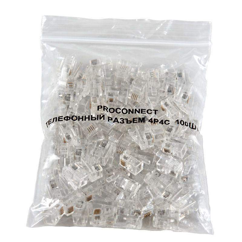 Телефонный разъем 4P4C PROconnect предназначен для соединения телефонной аппаратуры двух или четырехжильным кабелем, а также другого оборудования, имеющего гнездо разъема 4P4C. Размещается на конце телефонных кабелей для соединения с розеткой такого типа. Называется "трубочным", поскольку используется для подключения телефона к телефонной трубке. Штекер изготовлен из прозрачного качественного пластика и имеет 4 посадочных места и 4 ножа-контакта. На контакты (ножи) нанесен слой технического золота для безупречной пропускной способности разъема. Для опрессовки разъема на кабеле необходим специальный обжимной инструмент.