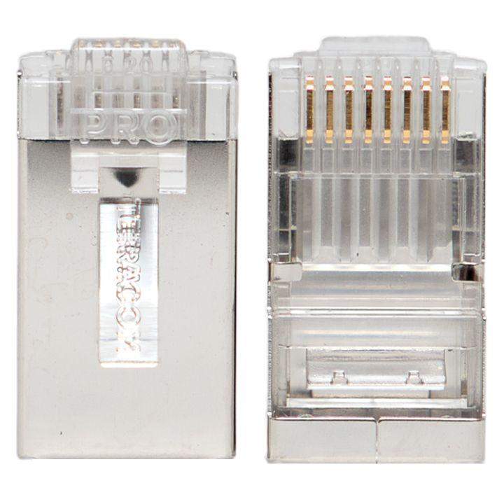 Коннекторы (вилки) RJ45 предназначены для терминирования кабелей витая пара по схеме 8P8C и последующей их надежной и безопасной коммутации с активным и пассивным оборудованием, информационными розетками на рабочих местах, модулями Keystone в рамках построения и организации сетей передачи данных. Коннекторы TERACOM® изготовлены из качественных материалов, а контакты имеют золотое покрытие толщиной до 30 мкд, что позволяет передавать данные по кабелю с максимальной скоростью и с минимальными потерями и ошибками. Также вилки RJ45 TERACOM® поддерживают 4 класс технологии PoE и передачу мощности до 90 Вт на один порт, что позволяет использовать их совместно с кабелем для энергоснабжения удаленных устройств.