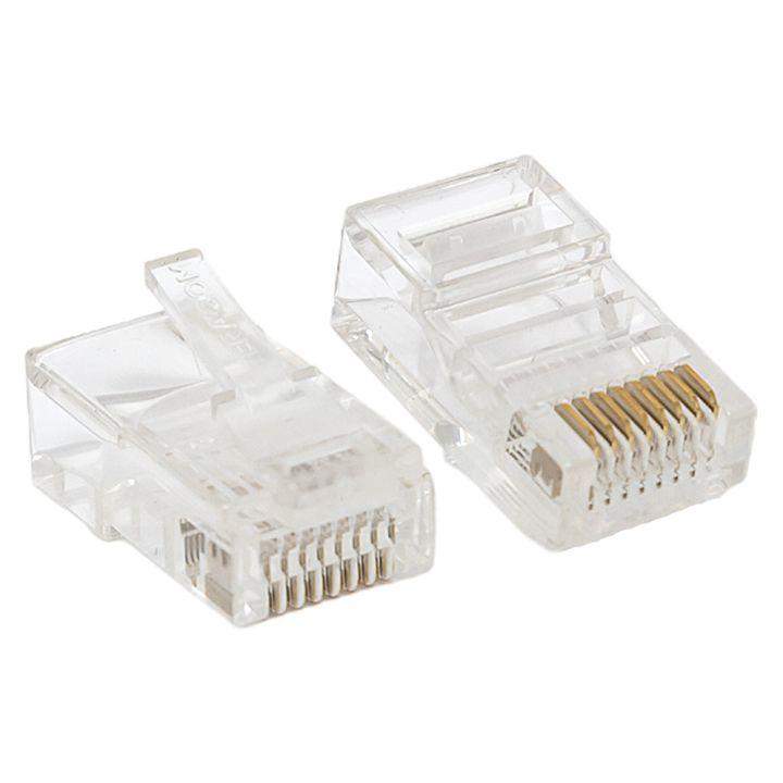 Коннекторы (вилки) RJ45 предназначены для терминирования кабелей витая пара по схеме 8P8C и последующей их надежной и безопасной коммутации с активным и пассивным оборудованием, информационными розетками на рабочих местах, модулями Keystone в рамках построения и организации сетей передачи данных. Коннекторы TERACOM® изготовлены из качественных материалов, а контакты имеют золотое покрытие толщиной до 30 мкд, что позволяет передавать данные по кабелю с максимальной скоростью и с минимальными потерями и ошибками. Также вилки RJ45 TERACOM® поддерживают 4 класс технологии PoE и передачу мощности до 90 Вт на один порт, что позволяет использовать их совместно с кабелем для энергоснабжения удаленных устройств.