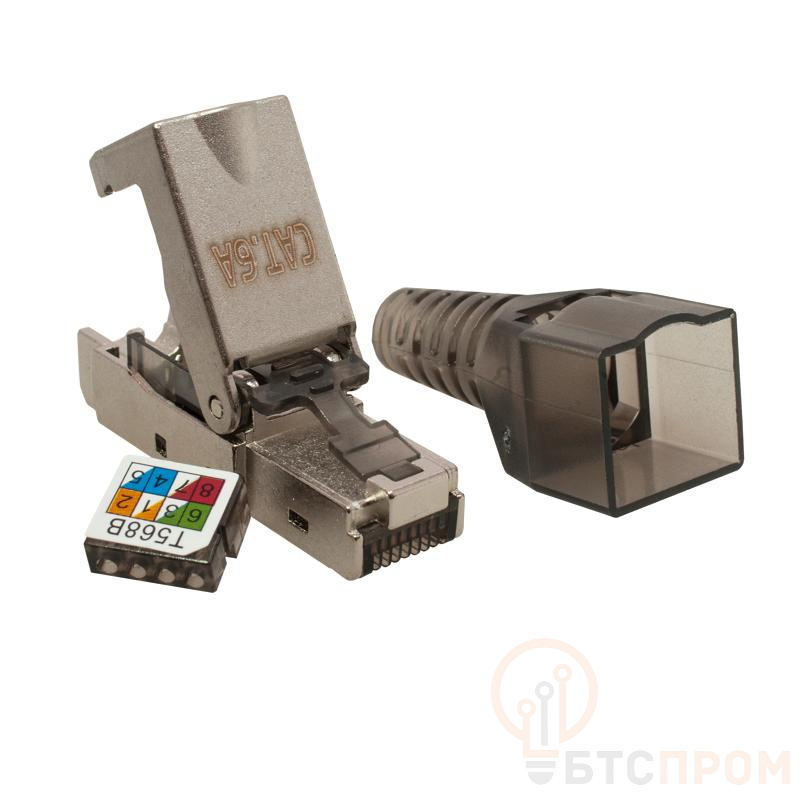 Коннектор RJ-45 с фиксатором кабеля используется для оконцевания кабеля витая пара в полевых условиях. Основными преимуществами такого коннектора является надежная конструкция из цельнолитого металлического корпуса, возможность использования его на кабелях большого диаметра (до 9 мм), надежная фиксация коннектора к кабелю.