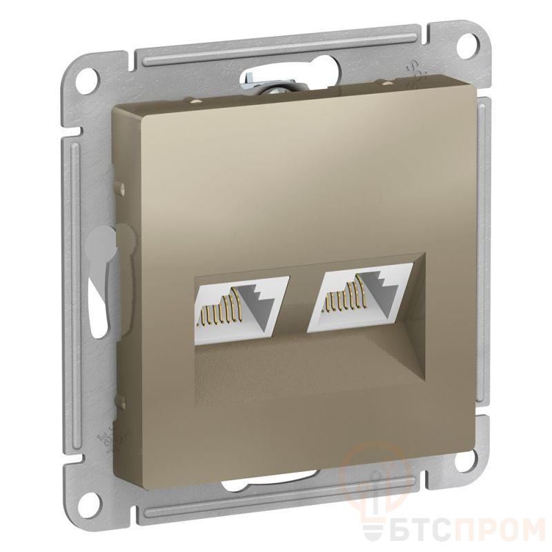Механизм Systeme Electric (ранее Schneider Electric) серии AtlasDesign в цвете шампань двойной розетки компьютерной с разъёмом RJ45 категория 5е предназначен для удобного и быстрого подключения вашего компьютера к локальной вычислительной сети. - Лицевые детали из качественного ABS-пластика, устойчивого к царапинам и УФ-излучению. - Усиленные прямые монтажные лапки для лучшей фиксации механизма в монтажной коробке.