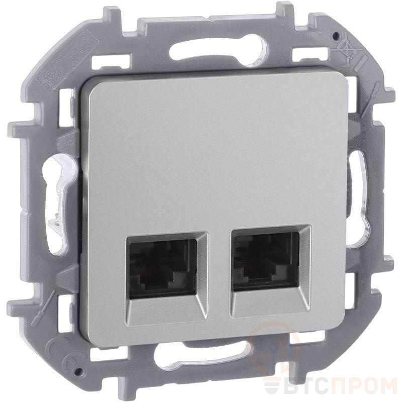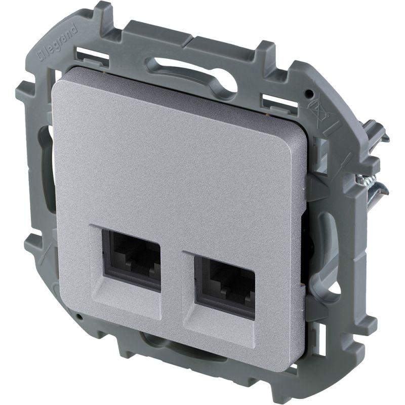 Розетка компьютерная двойная для скрытого монтажа Inspiria, 2 разъема RJ45 категория 6 UTP, цвет "Алюминий". Предназначена для быстрого подключения персональных компьютеров, принтеров, роутеров и другого оборудования к информационным сетям категории 6 со скоростью передачи данных 1 Гб/сек. Подходит для использования в сетях категории 5е. Возможно прямое подключение 2 устройств и 2 кабелей.