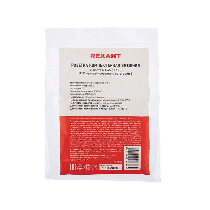 Внешняя неэкранированная компьютерная розетка REXANT используется для подключения к сети различного оборудования. Устройство оснащено двумя гнездами RJ- 45 категории 6 под разъем 8Р-8С (8 посадочных мест и 8 контактов). Кабель фиксируется с помощью зажимных контактов. Розетку с легкостью можно закрепить на стене с помощью двустороннего клейкого основания или двух шурупов. Корпус выполнен из прочного пластика. Благодаря высокому качеству и низкой цене розетка станет незаменимым устройством в любом офисе или предприятии. Технические характеристики: Тип установки: стационарно на стену Количество портов: 1 Категория: 6 Полоса пропускания: 250 МГц Тип разъема: RJ45/8р8с Исполнение: неэкранированное Тип терминирования: 110/Krone Эксплуатация: Подключаемые проводники: одножильные 22 – 26 AWG Количество подключений: не менее 750 циклов Усилие удержания разъема: 50Н/1 мин Допустимая температура монтажа: от 0 до +50 Допустимая температура эксплуатации: от -10 до +60