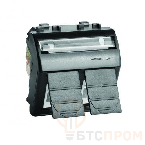 Розетка компьютерная RJ-45 с 2 разъемами. Назначение: подсоединение кабеля к компьютеру, принтеру и прочей оргтехнике. Характеристики: 8P8C; комплектуются 2-модульными гнездами; для заделки контактов в розетки использовать инструмент типа 110; с пылезащитными шторками (крышками); с окном (полем) для маркировки "рабочего места", размер окна - 6х37 мм. Категория: 5е. Кол-во модулей: 2. Цвет: черный