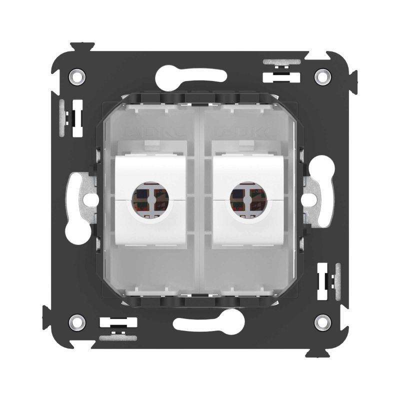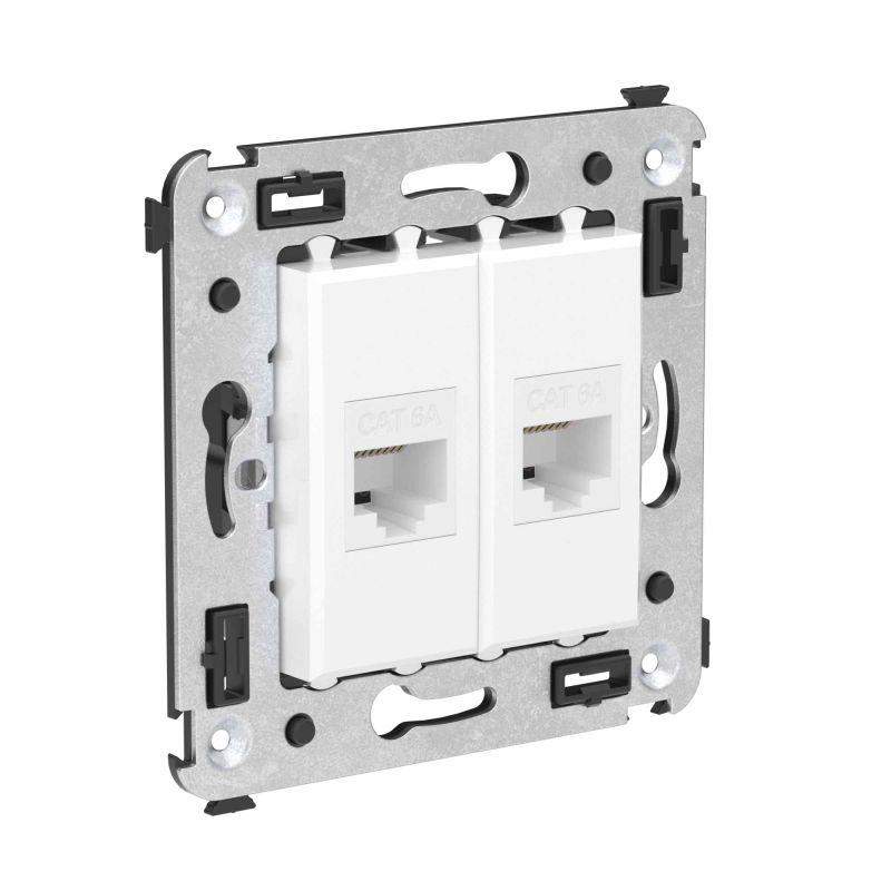Компьютерная розетка двойная без шторки используется для подключения компьютерной техники и соединения с патч-панелью. Предназначена для скрытого монтажа в стену, поставляется в комплекте с суппортом. Розетка RJ-45 категории 6А может использоваться для организации сетей с частотой до 500 МГц и передавать данные до 10 Гбит/с. Материал розетки – металл, термопласт. Пластиковые детали изделия выполнены в цвете "Белое облако".