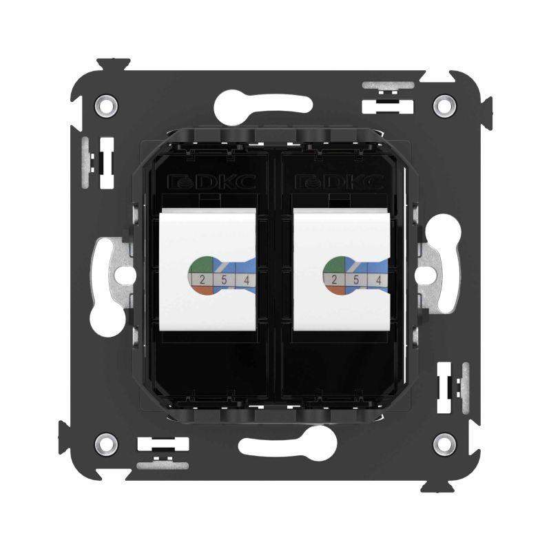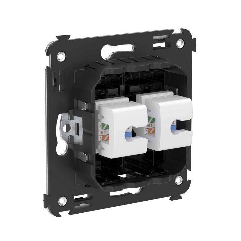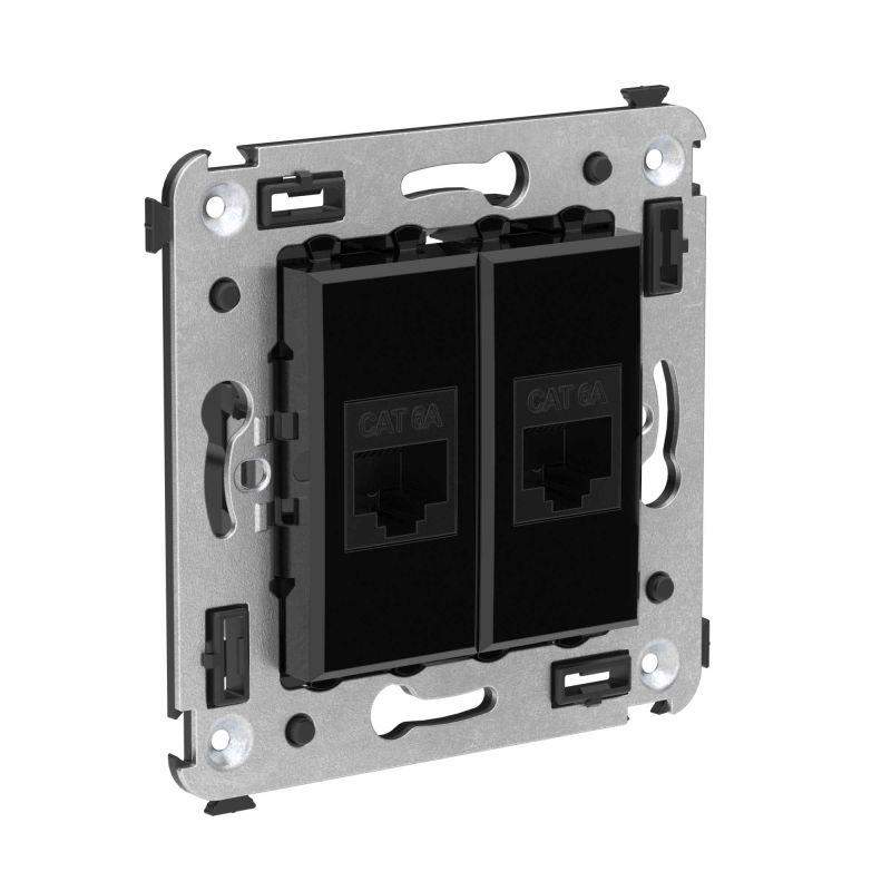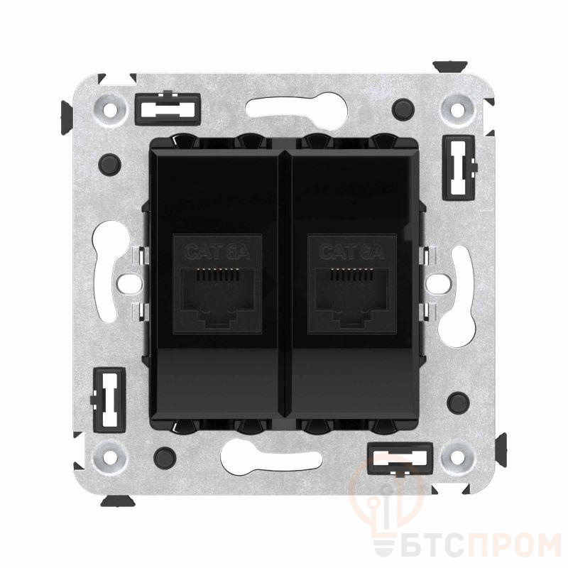 Компьютерная розетка двойная без шторки используется для подключения компьютерной техники и соединения с патч-панелью. Предназначена для скрытого монтажа в стену, поставляется в комплекте с суппортом. Розетка RJ-45 категории 6А может использоваться для организации сетей с частотой до 500 МГц и передавать данные до 10 Гбит/с. Материал розетки – металл, термопласт. Пластиковые детали изделия выполнены в цвете "Черный квадрат".