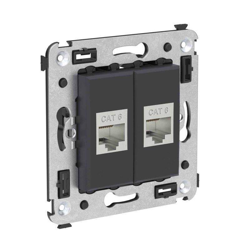 Компьютерная розетка двойная экранированная используется для подключения компьютерной техники и соединения с патч-панелью, предназначена для скрытого монтажа в стену, поставляется в комплекте с суппортом. Розетка RJ-45 категории 6 может использоваться для организации сетей с частотой до 250 МГц и передавать данные на большие расстояния. Материал розетки – металл, термопласт. Пластиковые детали изделия выполнены в цвете "Черный матовый".
