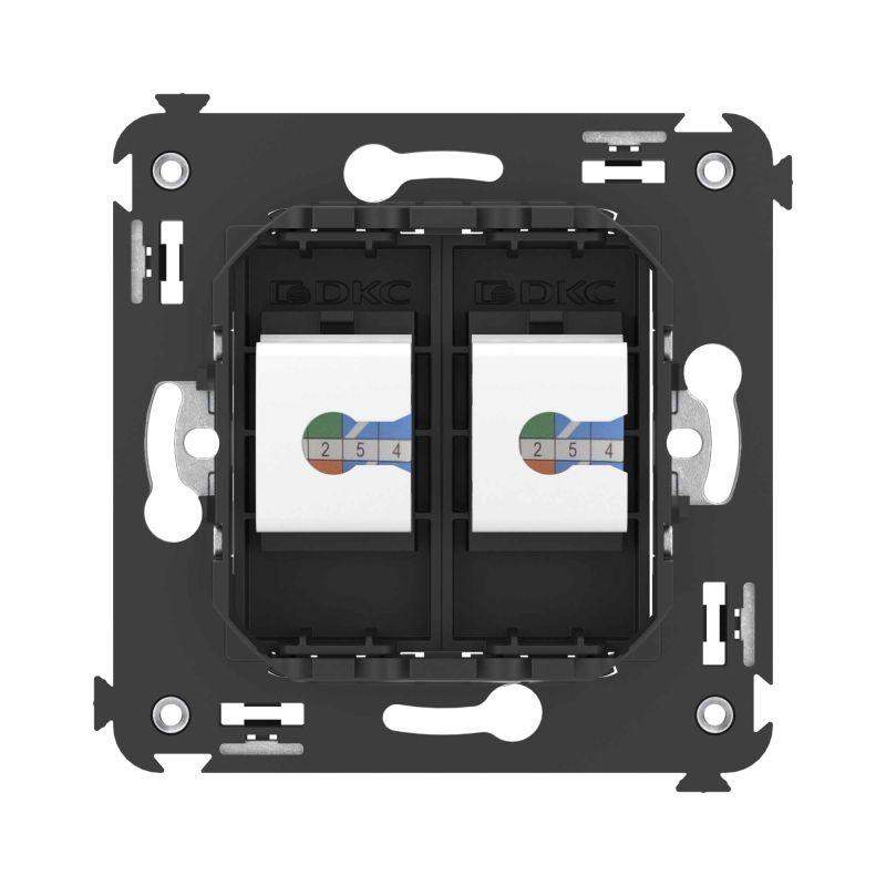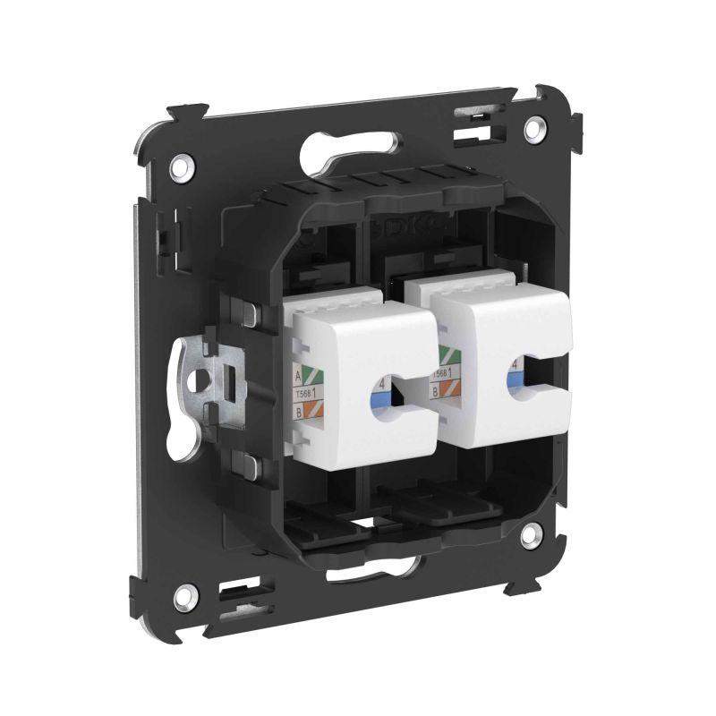Компьютерная розетка двойная без шторки используется для подключения компьютерной техники и соединения с патч-панелью. Предназначена для скрытого монтажа в стену, поставляется в комплекте с суппортом. Розетка RJ-45 категории 6А может использоваться для организации сетей с частотой до 500 МГц и передавать данные до 10 Гбит/с. Материал розетки – металл, термопласт. Пластиковые детали изделия выполнены в цвете "Черный матовый".