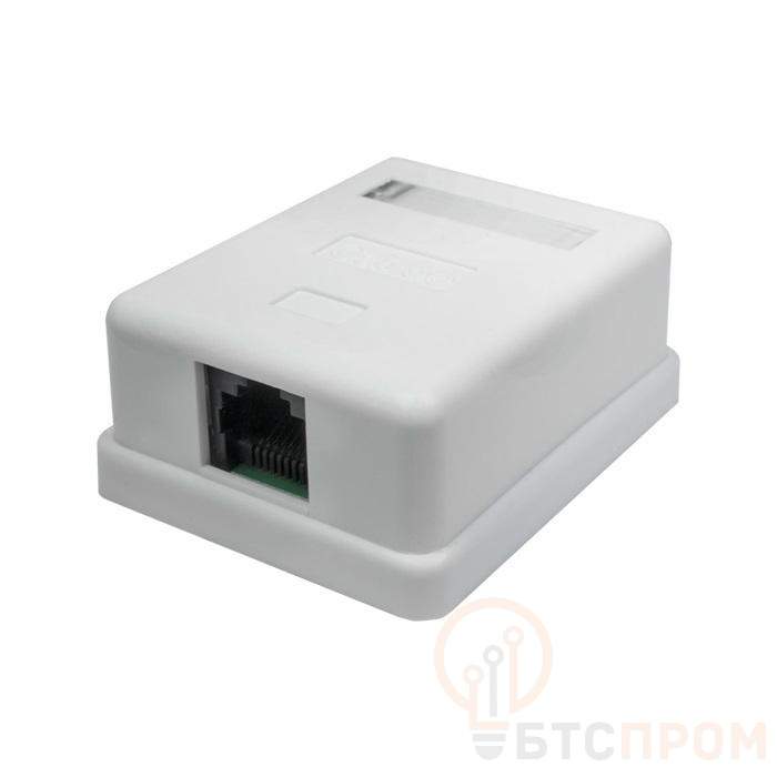 Неэкранированная компьютерная розетка настенного монтажа. Соответствует характеристикам категории 5е. Имеет 1 порт RJ-45 (8р8с). На печатной плате установлены контакты типа Dual IDC с цветной маркировкой по двум стандартам: T568 А и B. Ножи контактов располагаются под 45°, что лучше сказывается на передаточных характеристиках разъема. Для заделки проводников подходят ножи тип 110 и Krone. В комплект розетки входит двусторонняя клеевая площадка, винты для крепления к стене и стяжка для фиксации кабеля в розетке.