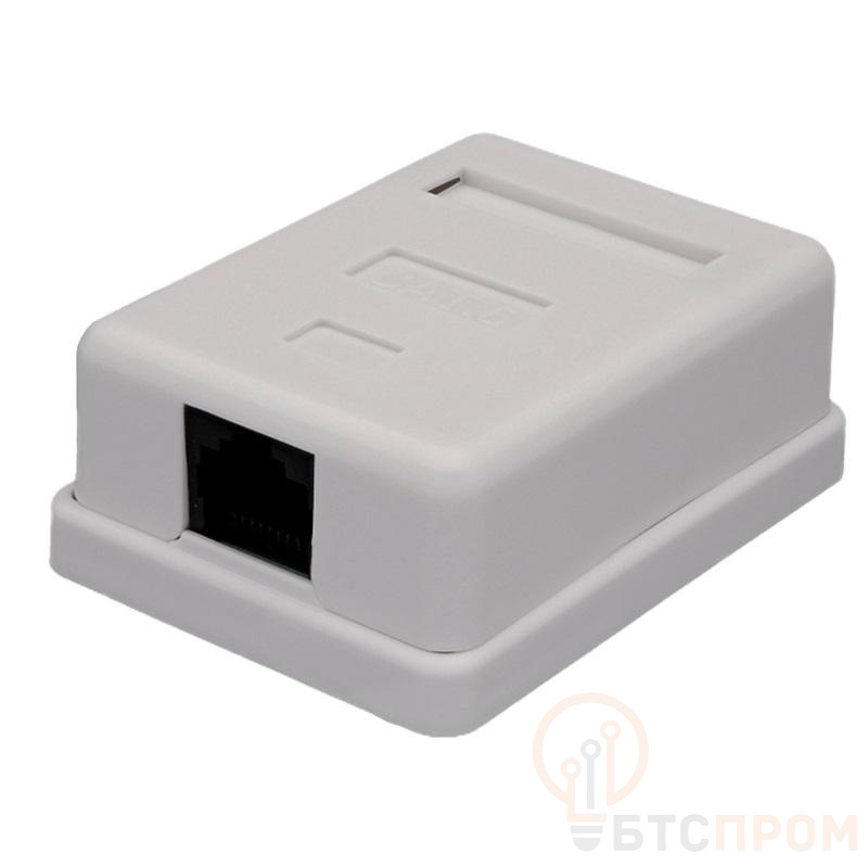 Неэкранированная компьютерная розетка настенного монтажа. Соответствует характеристикам категории 6. Имеет 1 порт RJ-45 (8р8с). На печатной плате установлены контакты типа Dual IDC с цветной маркировкой по двум стандартам: T568 А и B. Ножи контактов располагаются под 45°, что лучше сказывается на передаточных характеристиках разъема. Для заделки проводников подходят ножи тип 110 и Krone. В комплект розетки входит двусторонняя клеевая площадка, винты для крепления к стене и стяжка для фиксации кабеля в розетке.