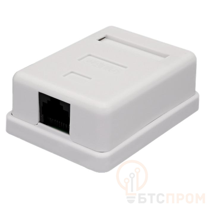 Неэкранированная компьютерная розетка настенного монтажа. Соответствует характеристикам категории 6. Имеет 1 порт RJ-45 (8р8с). На печатной плате установлены контакты типа Dual IDC с цветной маркировкой по двум стандартам - T568 А и B. Ножи контактов располагаются под 45°, что лучше сказывается на передаточных характеристиках разъема. Для заделки проводников подходят ножи тип 110 и Krone. В комплект розетки входит двусторонняя клеевая площадка, винты для крепления к стене и стяжка для фиксации кабеля в розетке.