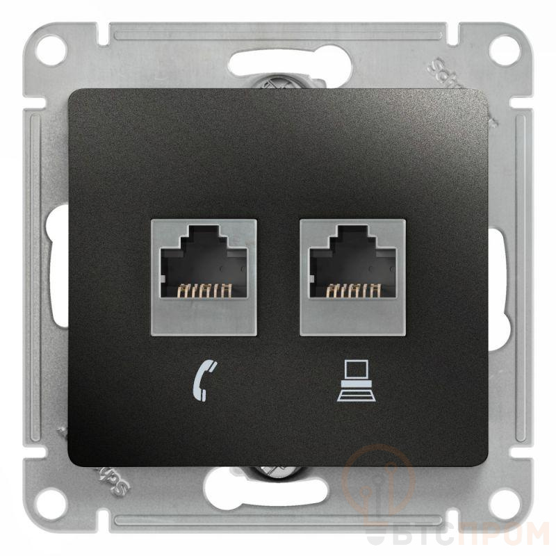 Механизм Systeme Electric (ранее Schneider Electric) серии Glossa (цвет антрацит) двойной розетки разъёмами RJ45 категория 5е и RJ11 предназначен для удобного и быстрого подключения вашего компьютера и телефона к соответствующим сетям. - Выполнен из материала PС+ASA, стойкого к УФ-излучению и появлению царапин.