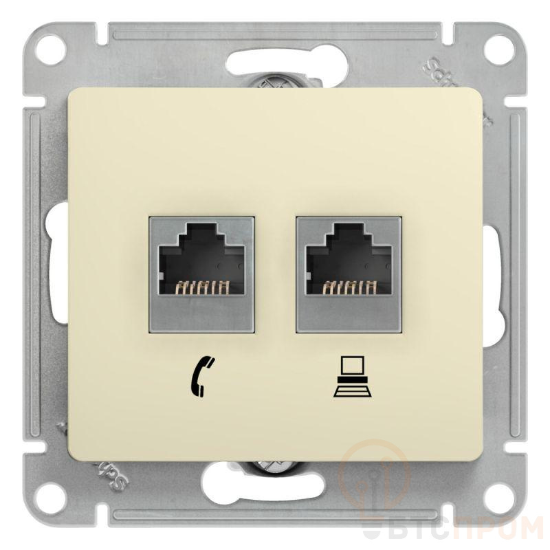 Механизм Systeme Electric (ранее Schneider Electric) серии Glossa (цвет бежевый) двойной розетки разъёмами RJ45 категория 5е и RJ11 предназначен для удобного и быстрого подключения вашего компьютера и телефона к соответствующим сетям. - Выполнен из материала PС+ASA, стойкого к УФ-излучению и появлению царапин.
