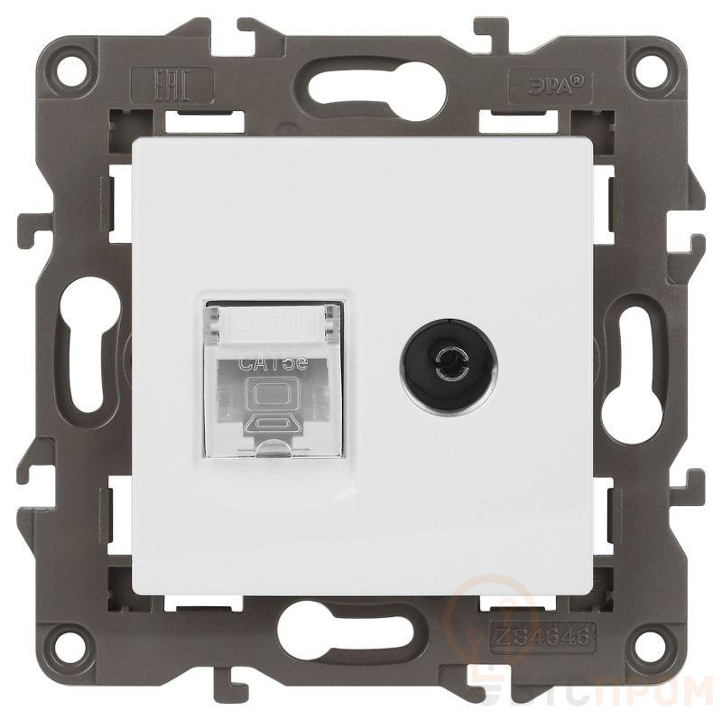 Розетка телевизионная + интернет серии Эра Elegance цвет белый 14-3110-01. Рамки приобретаются отдельно. Рамки Эра Elegance ПЛАСТИК: 1 пост 14-5001-хх, 2 поста 14-5002-хх, 3 поста 14-5003-хх, 4 поста 14-5004-хх, 5 постов 14-5005-хх; СТЕКЛО: 1 пост 14-5101-хх, 2 поста 14-5102-хх, 3 поста 14-5103-хх, 4 поста 14-5104-хх; МЕТАЛЛ: 1 пост 14-5201-хх, 2 поста 14-5202-хх, 3 поста 14-5203-хх, 4 поста 14-5204-хх; ДЕРЕВО: 1 пост 14-5301-хх, 2 поста 14-5302-хх, 3 поста 14-5303-хх, 4 поста 14-5304-хх (хх - код цвета: 00-прозрачный, 01-белый, белёный дуб, 02-слоновая кость, 03-алюминий, 04-шампань, 05-чёрный, чёрное дерево, 07-ясень, 09-дуб, 10-венге, 11-клён, 14-медь, 21-жёлтый, 22-оранжевый, 23-красный, 25-бордо, 26-лайм, 27-зелёный, 28-голубой, 29-синий, 30-розовый, 31-мокко, 32-серый, 41-сталь, 42-титан).