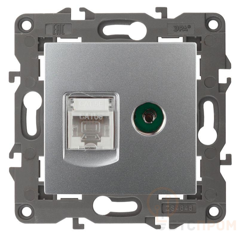 Розетка телевизионная + интернет серии Эра Elegance цвет алюминий 14-3110-03. Рамки приобретаются отдельно. Рамки Эра Elegance ПЛАСТИК: 1 пост 14-5001-хх, 2 поста 14-5002-хх, 3 поста 14-5003-хх, 4 поста 14-5004-хх, 5 постов 14-5005-хх; СТЕКЛО: 1 пост 14-5101-хх, 2 поста 14-5102-хх, 3 поста 14-5103-хх, 4 поста 14-5104-хх; МЕТАЛЛ: 1 пост 14-5201-хх, 2 поста 14-5202-хх, 3 поста 14-5203-хх, 4 поста 14-5204-хх; ДЕРЕВО: 1 пост 14-5301-хх, 2 поста 14-5302-хх, 3 поста 14-5303-хх, 4 поста 14-5304-хх (хх - код цвета: 00-прозрачный, 01-белый, белёный дуб, 02-слоновая кость, 03-алюминий, 04-шампань, 05-чёрный, чёрное дерево, 07-ясень, 09-дуб, 10-венге, 11-клён, 14-медь, 21-жёлтый, 22-оранжевый, 23-красный, 25-бордо, 26-лайм, 27-зелёный, 28-голубой, 29-синий, 30-розовый, 31-мокко, 32-серый, 41-сталь, 42-титан).