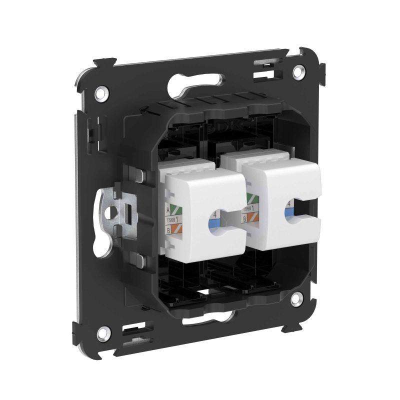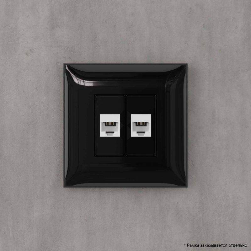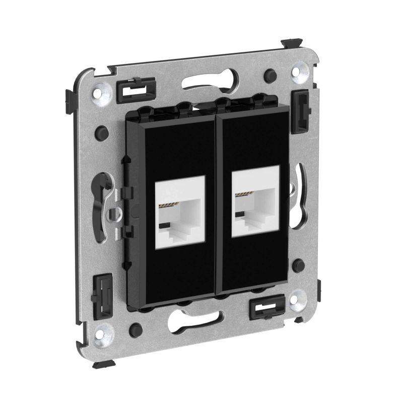 Телефонная розетка RJ-12 двойная без шторки используется для коммутации линий телефонной связи в патч-панелях или для связи телефонных аппаратов с розеткой. Предназначена для скрытого монтажа в стену, поставляется в комплекте с суппортом. Материал – металл, термопласт. Пластиковые детали электроустановочного изделия имеют цвет "Черный квадрат".