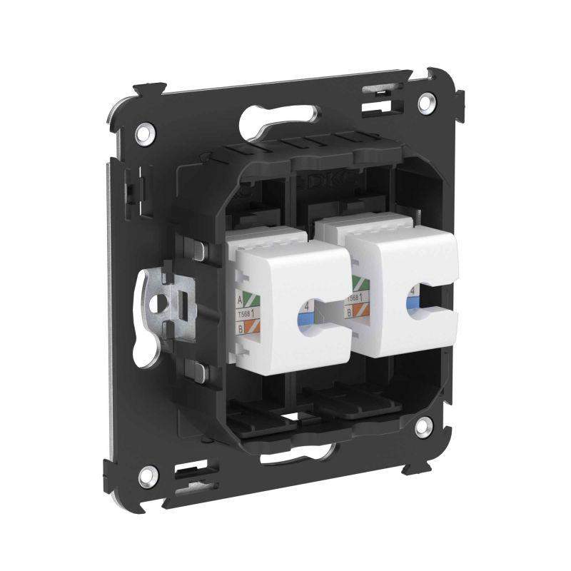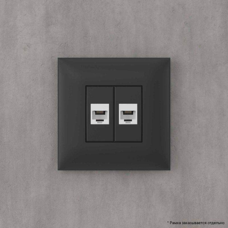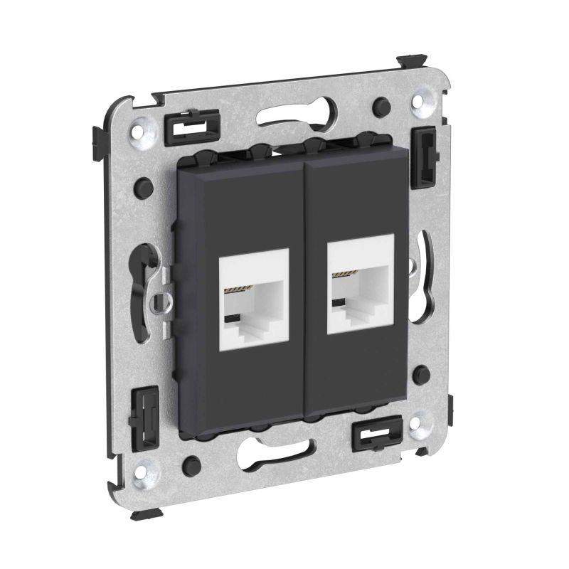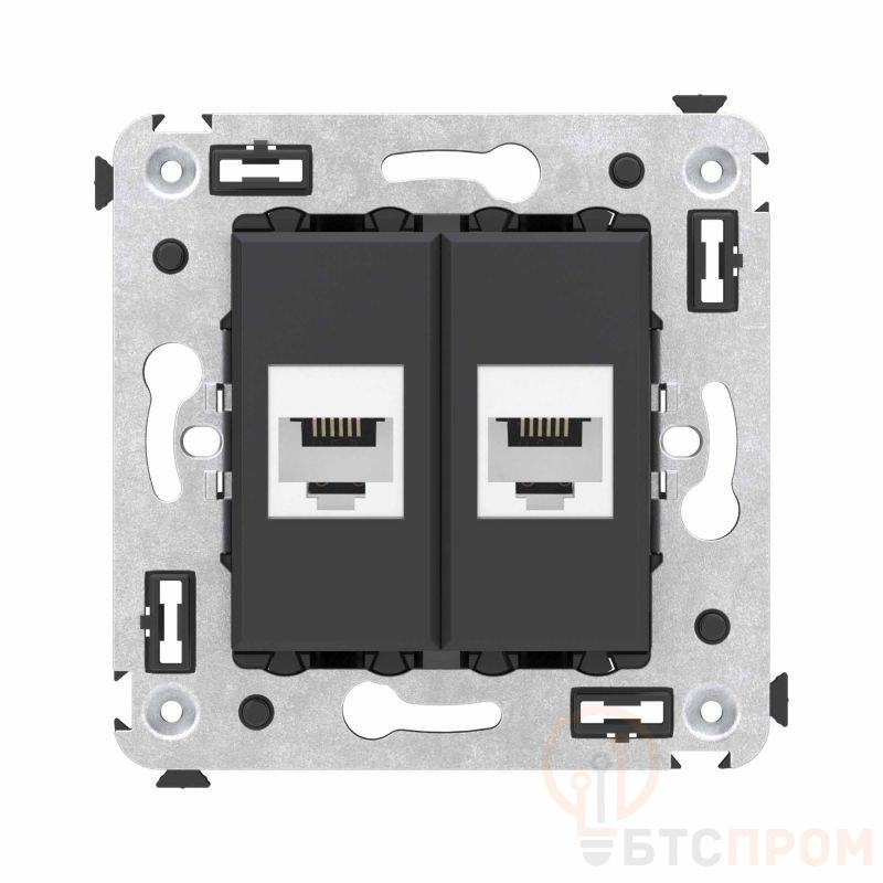 Телефонная розетка RJ-12 двойная без шторки используется для коммутации линий телефонной связи в патч-панелях или для связи телефонных аппаратов с розеткой. Предназначена для скрытого монтажа в стену, поставляется в комплекте с суппортом. Материал – металл, термопласт. Пластиковые детали электроустановочного изделия имеют цвет "Черный матовый".