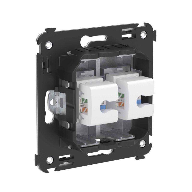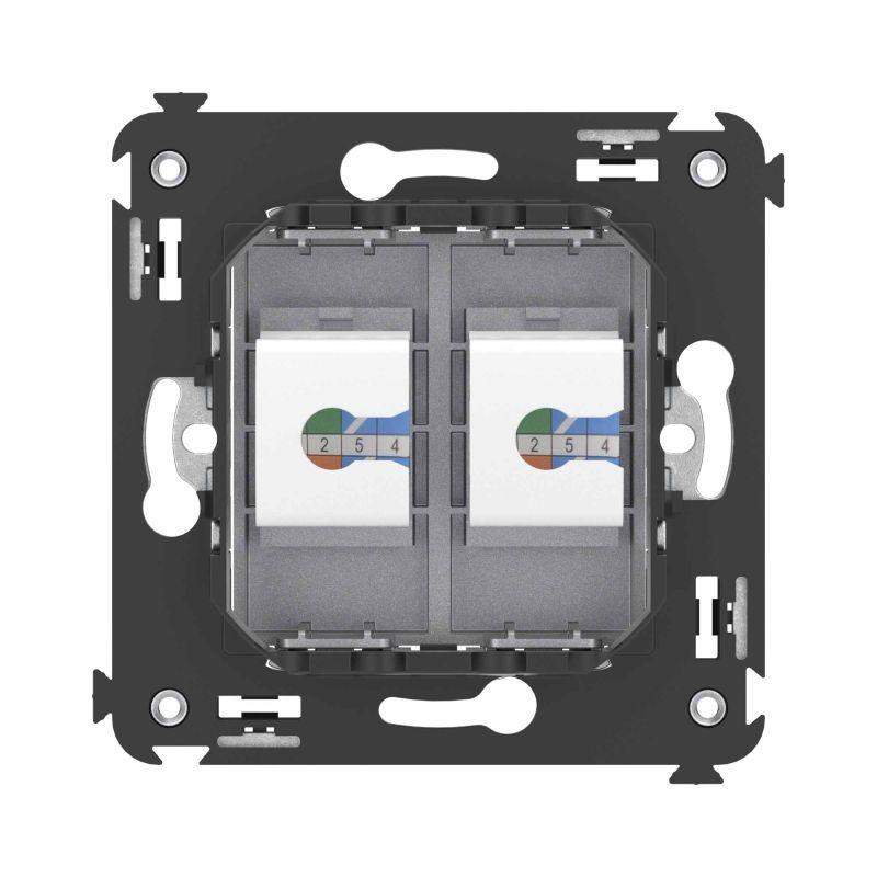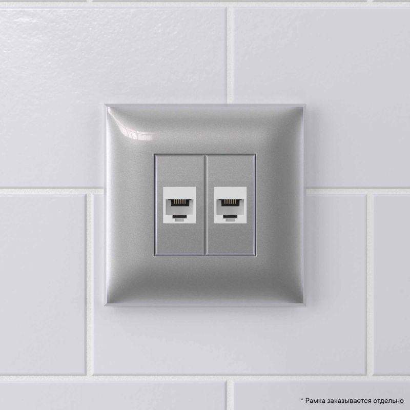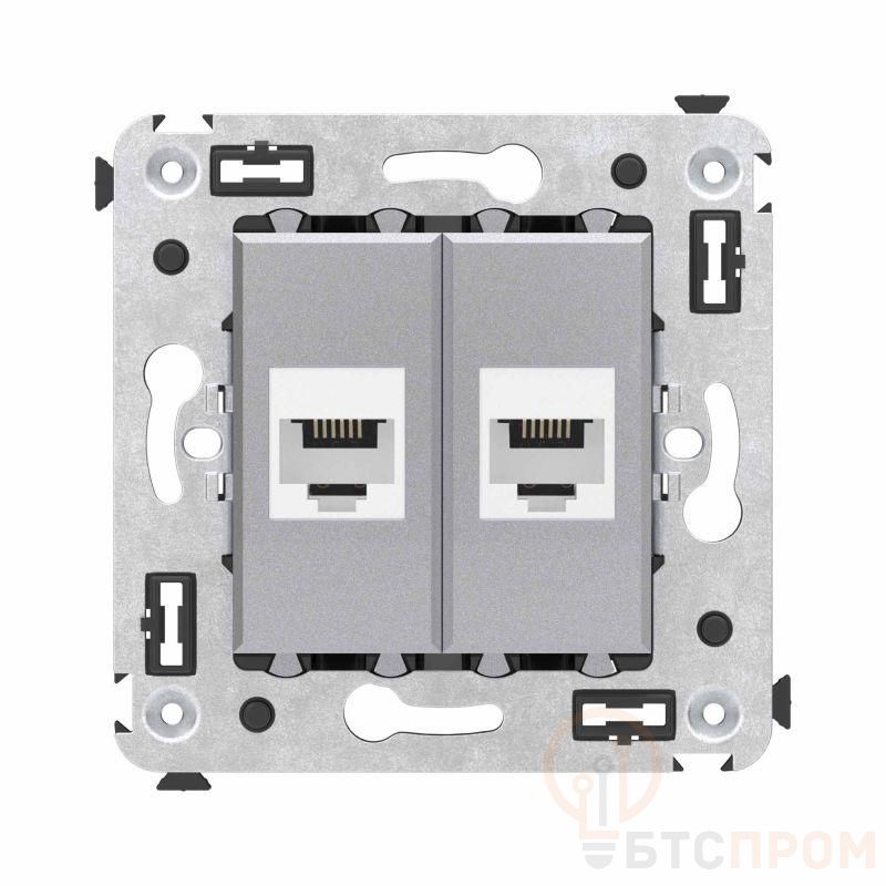 Телефонная розетка RJ-12 двойная без шторки используется для коммутации линий телефонной связи в патч-панелях или для связи телефонных аппаратов с розеткой. Предназначена для скрытого монтажа в стену, поставляется в комплекте с суппортом. Материал – металл, термопласт. Пластиковые детали электроустановочного изделия имеют цвет "Закаленная сталь".