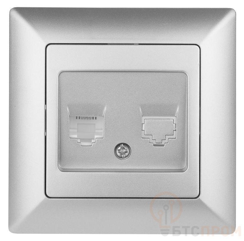 Розетка телефонная RJ11, серии Solo, скрытой установки 4-302-03 цвет алюминий. Выполнена из негорючего термопластика, укомплектована одноместной рамкой.