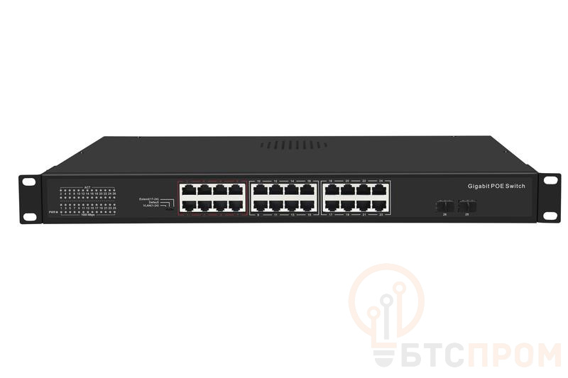 Неуправляемый коммутатор GL-SW-G005-24P – продукт бренда GIGALINK, предназначенный для соединения нескольких устройств локальной вычислительной сети (LAN) или нескольких сегментов данной сети. Модель имеет 24 основных PoE портов со скоростью передачи данных 10/100/1000 Мбит/c (порты с 17 по 24 поддерживают расширенный режим PoE до 250 метров на скорости 10 Мбит/с), 2 Uplink порта 1000 Мбит/c SFP. Общий PoE-бюджет составляет 400 Вт. Коммутатор обладает автоопределением скорости и полярности, что сводит к минимуму время и сложность подключения. Устройство выполнено в металлическом корпусе, который обеспечивает дополнительную защиту от случайных ударов. Его можно установить как в шкаф 19”, так настольно. Решение отлично подойдет для применения в небольших и простых сетях. А наличие PoE портов дает возможность устанавливать коммутатор на удаленные и высотные участки, чтобы питать камеры и сети для использования в системах видеонаблюдения, СКУД, пожарной безопасности и т.д.