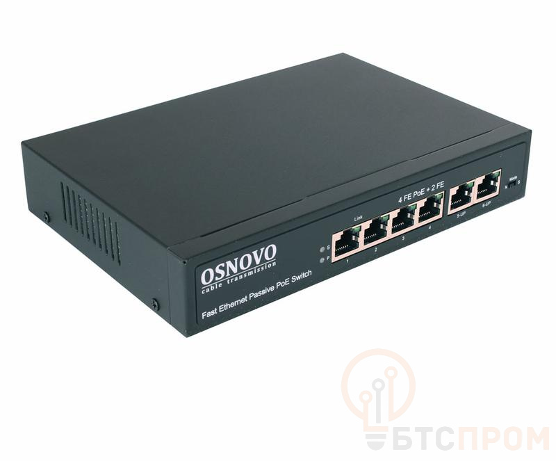 Коммутатор Passive PoE SW-20600/A(80Вт) Fast Ethernet от OSNOVO — это надежное и простое решение для построения сетевой инфраструктуры, совмещающее передачу данных и питания по одному кабелю. Устройство оснащено 6 портами 10/100 Мбит/с, которые поддерживают технологию Passive Power over Ethernet, что позволяет подавать питание напрямую на совместимые устройства, такие как точки доступа, IP-камеры и маломощные коммутаторы, без необходимости использования отдельных блоков питания.
