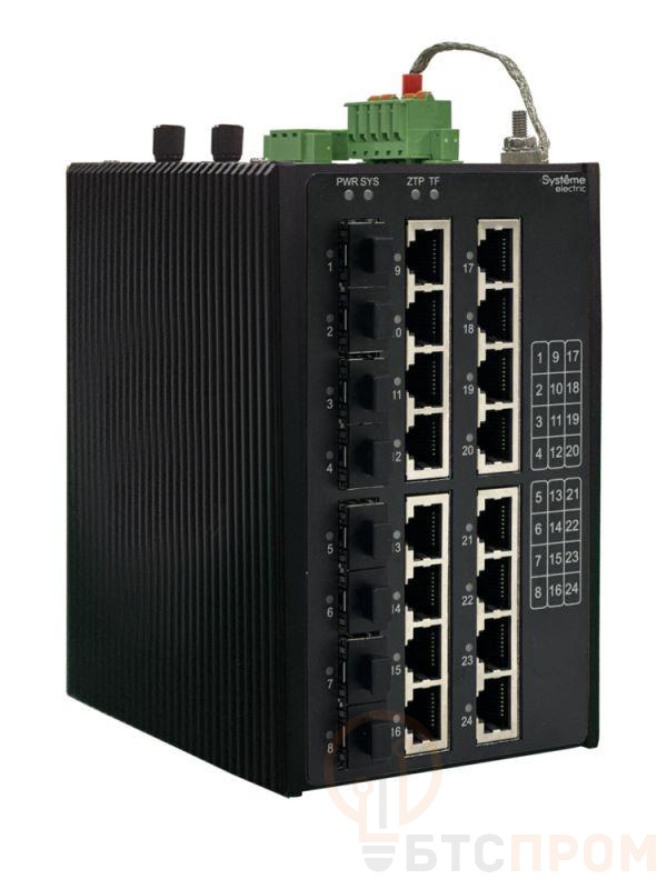 Управляемый промышленный коммутатор Ethernet, изготовленный из антикоррозионного алюминиевого сплава; уровень 3; общее количество портов: 24 (8х100/1000/2500BaseX SFP, 16х10/100/1000BaseT); 1 порт CLI; 1 порт MGT; 1 реле сигнализации; класс защиты IP40; рабочая температура: -40…+85 °C; напряжение питания: резервируемое 100 - 240 VAC ИЛИ резервируемое питание: 24 - 240 VDC.