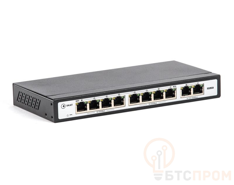 Специализированный неуправляемый PoE plus коммутатор. Поддержка питания по технологии PoE (питание по Ethernet кабелю стандарт IEEE 802.3af/at) по 8 портам. Коммутатор автоматически определяет тип питания подключённых устройств. Дополнительные 2 порта UPLINK RJ45 10/100/1000Mbps обеспечивают возможность подключения регистратора, роутера или дополнительных коммутаторов. Суммарная мощность потребителей составляет 120 Вт. Мощность на канал — до 30 Вт. Режим VLAN обеспечивает безопасность передачи данных и увеличение дальности передачи данных до 250 метров. Защита от грозовых разрядов — 4 кВ.