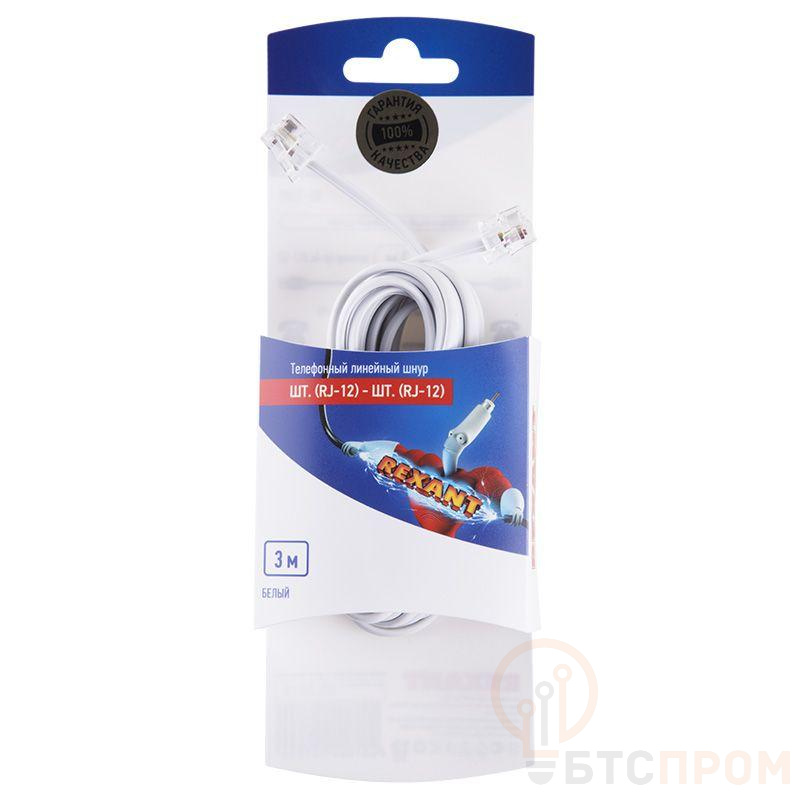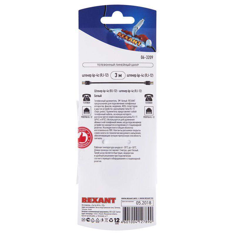 Телефонный удлинитель 3М белый REXANT предназначен для подключения телефонных аппаратов, факсов, модемов, ADSL сплиттеров и других устройств с разъемами типа RJ-11 (Евро джек). Удлинитель представляет собой телефонный кабель, на концах которого располагаются опрессованные разъемы RJ-11 (6P4C и 6P2C). Используется для удлинения абонентской телефонной линии, когда подключаемое устройство находится в отдалении от стационарной розетки. Изоляция жил и общая оболочка изготовлена из ПВХ. Контакты разъемов покрыты слоем золота по технологии вакуумного напыления, обеспечивающие лучшую пропускную способность сигнала. Рабочая температура шнура от -20? до +50?. Длина провода составляет 3 метра, цвет белый. Такой шнур является быстрым, недорогим и удобным решением при подключении соответствующего оборудования к стационарной розетке.