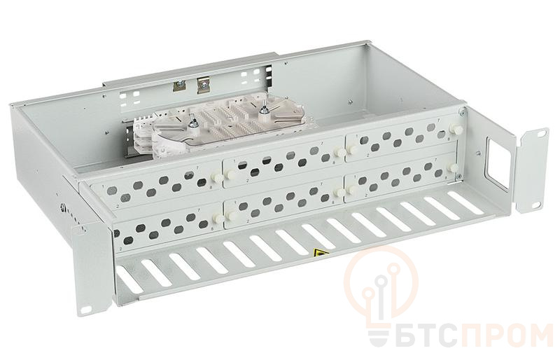Корпус оснащен 4-мя универсальными адаптерными панелями с общим количеством портов 48, поддерживающих соединения типа FC/ST. Это позволяет выполнять высокоплотное размещение оптических разъемов. Конструкция включает в себя органайзеры и сплин-кассеты для аккуратной укладки и защиты волокон, систему кабельных вводов, а также перфорированные съемные боковые панели для удобства монтажа и обслуживания.