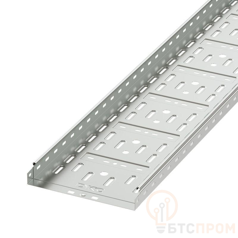 Перфорированные листовые лотки ДКС применяются для прокладки кабеля как в помещении, так и на открытом воздухе. Лотки отличаются высокой несущей способностью – подформовка, производимая при производстве этой продукции, создает дополнительное ребро жесткости, что увеличивает несущую способность системы до 54%. Перфорация сокращает вес конструкции. В лотках имеются отверстия для отвода кабеля. Степень пыле- и влагозащиты перфорированных лотков – IP 10 при использовании крышек, входящих в состав системы. Метод соединения "мама-папа" применяемый для системы, существенно сокращает время монтажа и создает непрерывный контур. Конструктив листовых лотков ДКС предупреждает повреждение кабеля при прокладке. Высота лотка – 50 мм, ширина – 300 мм, длина – 3000 мм, толщина - 0,7 мм. Перфорированные лотки в исполнении "Цинк-ламель" имеют специальное покрытие, устойчивое к коррозии из химически активной магниевой смолы с добавлением хлопьев цинка и алюминия. Цинк-ламельное покрытие изделий ДКС по коррозионной устойчивости аналогично покрытию "Горячий цинк". Оно обеспечивает электрохимическую и барьерную защиту от коррозии.