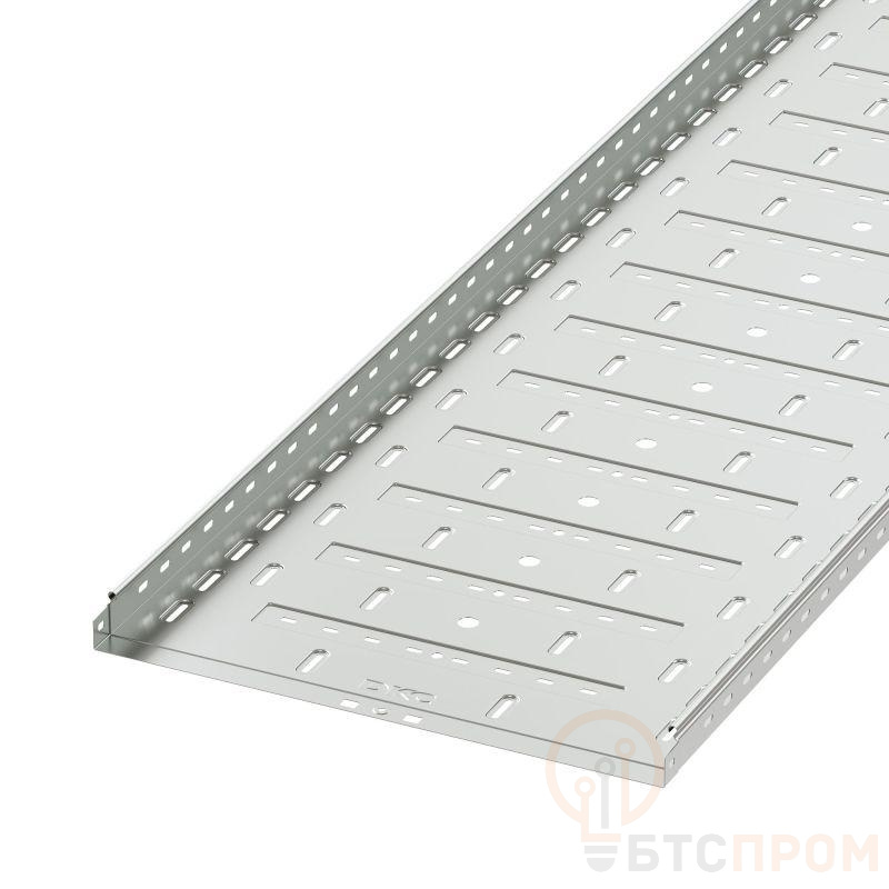 Перфорированные листовые лотки ДКС применяются для прокладки кабеля как в помещении, так и на открытом воздухе. Лотки отличаются высокой несущей способностью – подформовка, производимая при производстве этой продукции, создает дополнительное ребро жесткости, что увеличивает несущую способность системы до 54%. Перфорация сокращает вес конструкции. В лотках имеются отверстия для отвода кабеля. Степень пыле- и влагозащиты перфорированных лотков – IP 10 при использовании крышек, входящих в состав системы. Метод соединения "мама-папа" применяемый для системы, существенно сокращает время монтажа и создает непрерывный контур. Конструктив листовых лотков ДКС предупреждает повреждение кабеля при прокладке. Высота лотка – 50 мм, ширина – 600 мм, длина – 3000 мм, толщина - 1 мм. Перфорированные лотки в исполнении "Цинк-ламель" имеют специальное покрытие, устойчивое к коррозии из химически активной магниевой смолы с добавлением хлопьев цинка и алюминия. Цинк-ламельное покрытие изделий ДКС по коррозионной устойчивости аналогично покрытию "Горячий цинк". Оно обеспечивает электрохимическую и барьерную защиту от коррозии.
