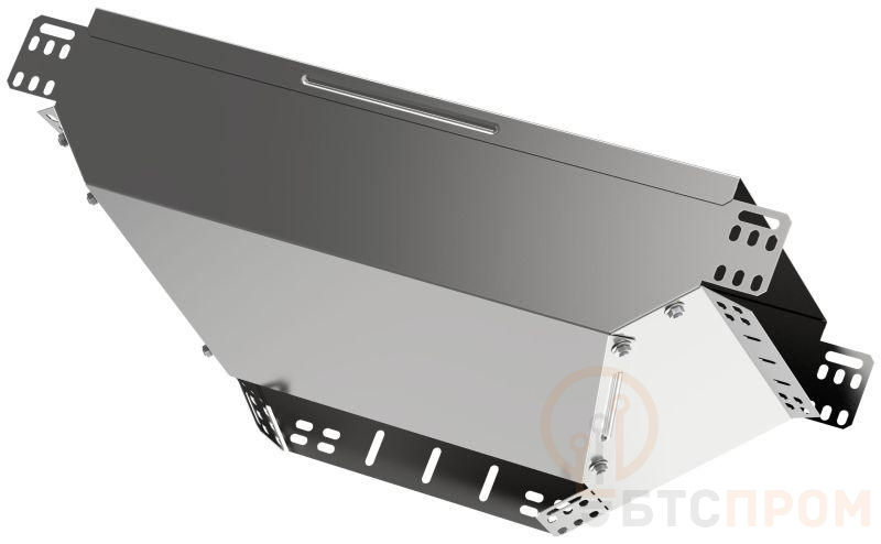 Ответвитель Т-образный вертикальный вниз боковой предназначен для организации Т-образного отвода кабельной трассы вниз с изменением направления лотка на 90 градусов. Аксессуар поставляется в комплекте с крышкой. Аксессуар изготовлен из стали горячего цинкования методом Сендзимира (защитный слой цинка не менее 10 мкм).