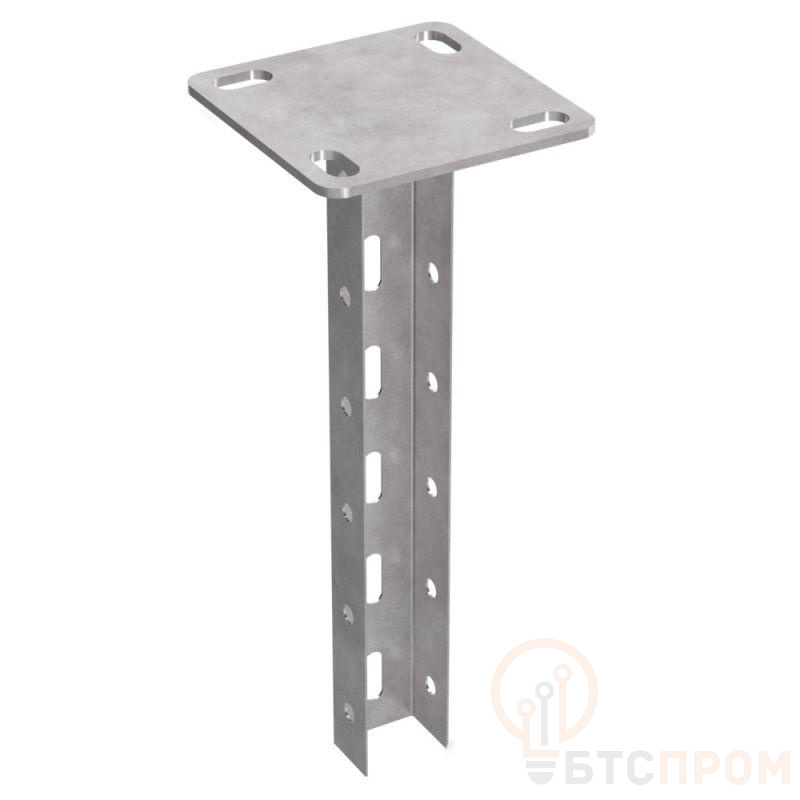 Стойка потолочная для средних нагрузок 35х30 с пяткой 120х120 это опорное изделие, состоящее из П-образного профиля и прямоугольного основания, сваренных между собой. П - образный профиль и прямоугольное основание из стальной пластины 4 мм. позволяют крепить стойку к потолку. Разные исполнения по длине данного изделия дают возможность подбирать оптимальный вариант для формирования нужных конструкций. Вдоль всего профиля имеется перфорация по трем плоскостям, обеспечивающая удобный монтаж стоечного кронштейна и двухстороннего стоечного кронштейна на необходимой вам высоте.