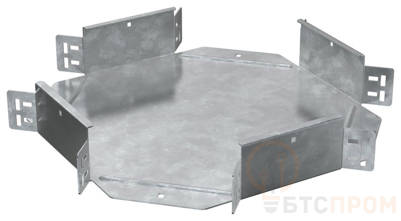 Крестовина предназначен для организации X-образного разветвления кабельной трассы в горизонтальной плоскости. Стыковка аксессуара с лотком осуществляется за счёт телескопического соединителя. Подходит для всех типов листовых лотков серии ESCA. Крышка на аксессуар заказывается отдельно. Аксессуар изготовлен из стали оцинкованной методом горячего погружения (защитный слой цинка не менее 55 мкм).