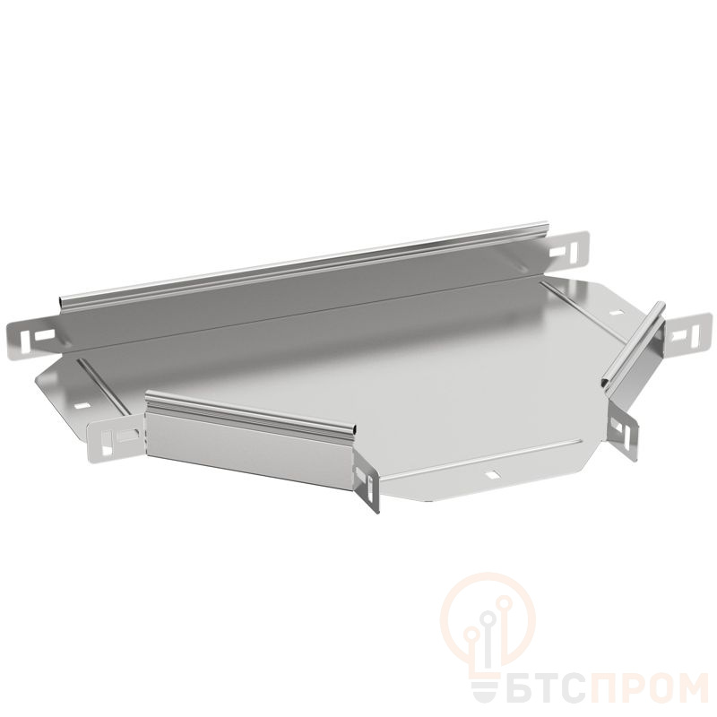 Конструкция ответвителя позволяет выполнять Т-образное присоединение лотка шириной 50 мм к магистральному лотку шириной 150 мм, обеспечивая аккуратное и технологичное ответвление кабельных линий. Все края изделия тщательно обработаны для безопасного монтажа.